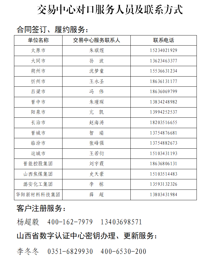 四、为做好相关工作,交易中心安排专人对接服务“11个地市+4大省属煤炭生产企业”。