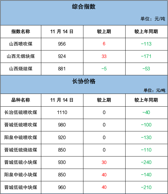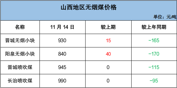 无烟煤市场以涨为主,块煤价格普遍上涨,末煤价格有涨有跌。块煤市场方面,本周尿素市场在出口配额政策调整等因素影响下涨后企稳,煤头装置开工率环比持续提升,下游尿素企业虽继续面临亏损,但在当前煤炭市场整体仍偏强运行,叠加民用需求有所释放下,无烟块煤市场仍以涨为主。晋城地区无烟中小块市场价环比涨18-25元/吨,同比跌106-135元/吨;阳泉地区无烟小块市场价环比涨90元/吨,同比跌95元/吨。截至11月14日,无烟小块坑口含税价格在840-940元/吨之间。