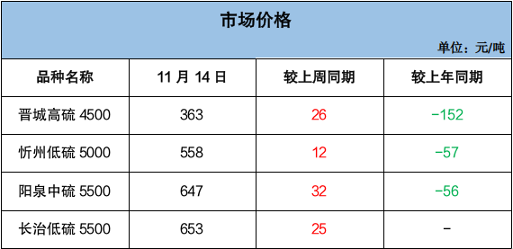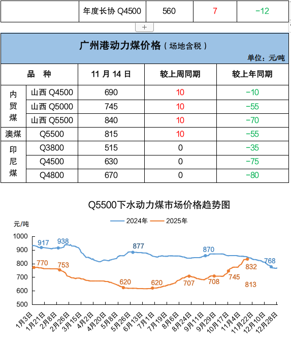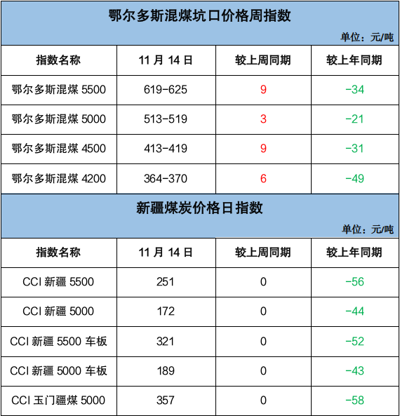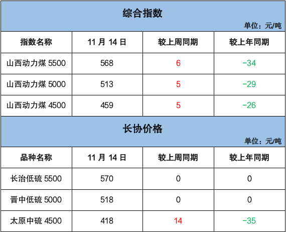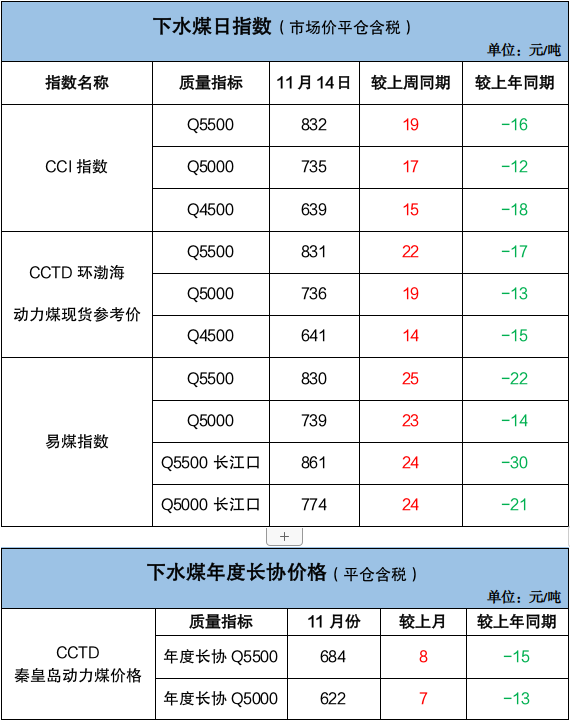 下水煤方面,11月份电煤年度长协Q5500价格684元/吨,月环比涨8元/吨、同比降15元/吨。终端需求提振一般,用户对高价货源接受度不高,贸易商出货意愿增强,报价涨幅收窄后逐步趋稳。截至11月14日,CCI 5500报收于832元/吨,日环比持平,周环比涨19元/吨,同比降幅收窄至16元/吨,较同热值年度长协价价差扩大至148元/吨。