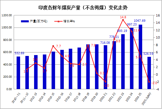 据印度煤炭部(Ministry of Coal)发布的统计数据显示,2025年1-10月,印度全国煤炭总产量(包括褐煤)为8.823亿吨,较上年同期下降0.8%。
