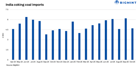 印度分析机构BigMint 平台11月7日发布的信息显示,2025年10月,印度焦煤进口量下降至470万吨,环比9月份的620万吨下降24%,而与2024年10月的430万吨相比仍高出9%。