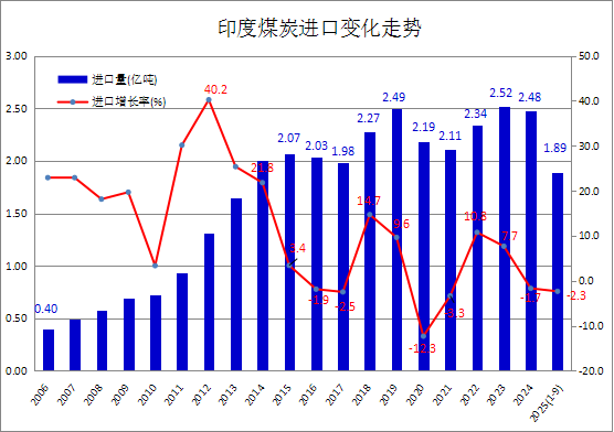 据印度商工部(Ministry of Commerce and Industry)11月24日发布的煤炭进口数据显示,2025年1-9月,印度煤炭进口量累计为1.89亿吨,较上年同期下降2.3%。