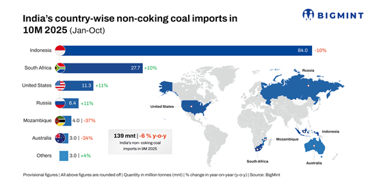 据印度BigMint 平台网站11月14日发布的信息,2025年1-10月,印度动力煤(Non-coking coal,非焦煤)进口量为1.39亿吨,较去年同期的1.49亿吨下降约6%。