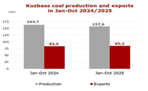 库兹巴斯煤炭工业部数据还显示,2025年 1-10月,库兹巴斯地区开采煤炭1.577亿吨,比2024年同期减少3.7%。产量降幅也在缩小,前9个月,该地区的煤炭总产量累计为1.408亿吨,同比下降4.8%。