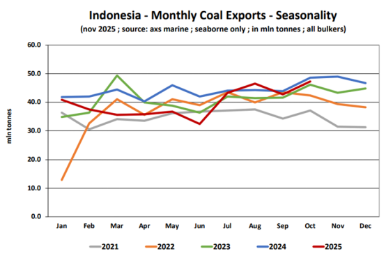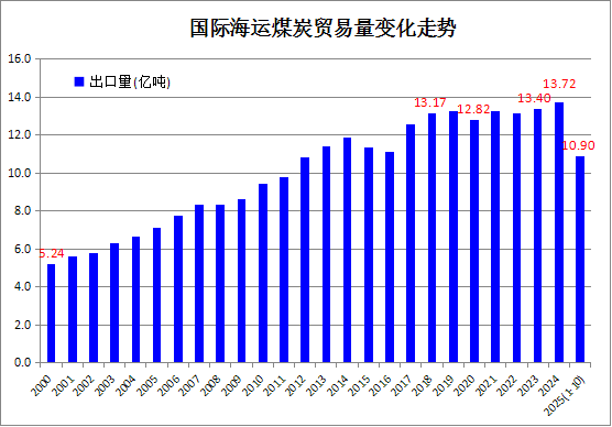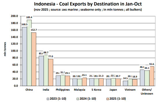 据船舶经纪与服务集团班切罗?科斯塔(Banchero Costa)最新发布的市场周报(MARKET REPORT – WEEK 47/2025),其援引AXS Marine船舶运输跟踪数据显示,2025年1-10月,国际海运煤炭船舶载运量(不包括各国国内沿海货物运输)累计为10.895亿吨,比去年同期下降3.6%。