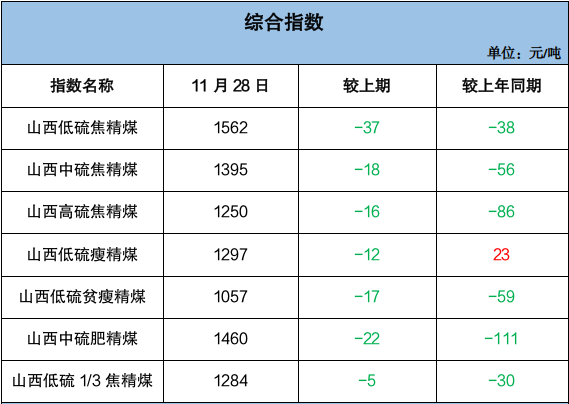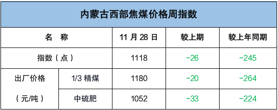 陕西、内蒙古炼焦煤价格周环比跌20-47元/吨,同比跌168-264元/吨。截至11月28日,陕西气煤价格942元/吨,内蒙古西部1/3焦煤价格1180元/吨、中硫肥煤价格1052元/吨。