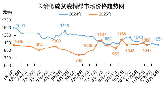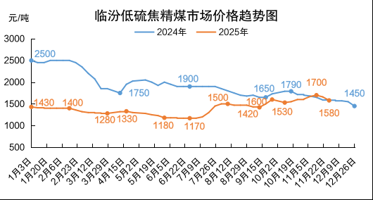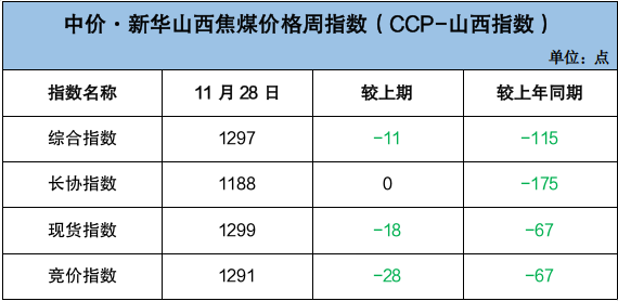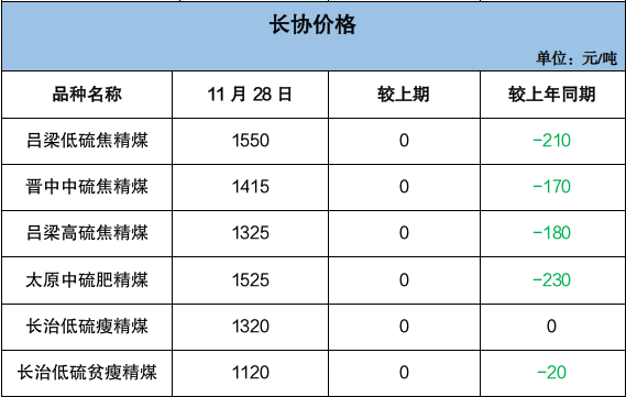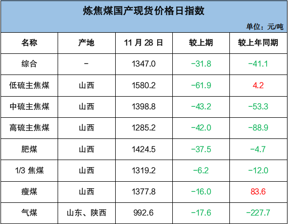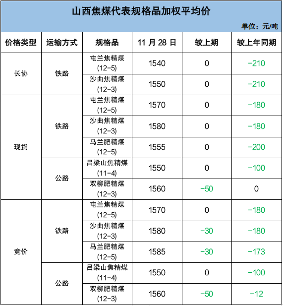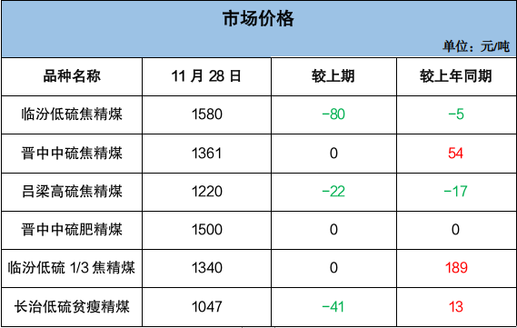 山西炼焦煤市场价格延续跌势,线上竞价销售仍有流单现象。吕梁、临汾主焦煤市场价格周环比跌20-80元/吨左右,配焦煤市场价格跌40-50元/吨不等。截至11月28日,临汾低硫主焦煤市场价格1580元/吨,周环比跌80元/吨,同比跌5元/吨;吕梁高硫主焦煤市场价格1220元/吨,周环比跌22元/吨,同比跌17元/吨。