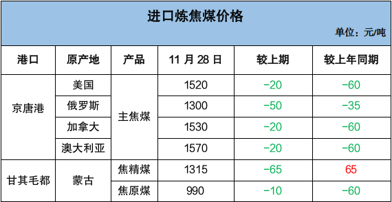 港口进口炼焦煤价格延续跌势。京唐港进口主焦煤价格周环比跌20-50元/吨,同比跌35-60元/吨;甘其毛都蒙古焦原煤、焦精煤价格周环比跌10-65元/吨,焦精煤同比涨65元/吨、焦原煤同比跌60元/吨。截至11月28日,京唐港俄罗斯主焦煤价格1300元/吨,澳大利亚主焦煤价格1570元/吨,甘其毛都蒙古焦精煤价格1315元/吨。