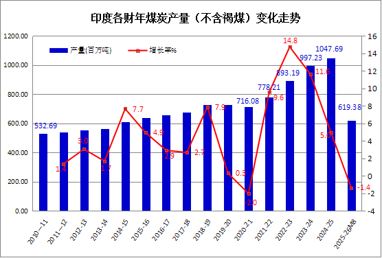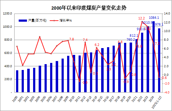 据印度煤炭部(Ministry of Coal)发布的统计数据显示,2025年1-11月,印度全国煤炭总产量(包括褐煤)为9.781亿吨,较上年同期下降0.6%。