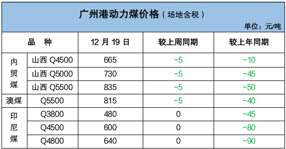 广州港内外贸煤价格稳中有跌,印尼煤场地含税价周环比以稳为主,澳大利亚Q5500场地含税价跌5元/吨,较同热值内贸煤价格仍具有一定优势。