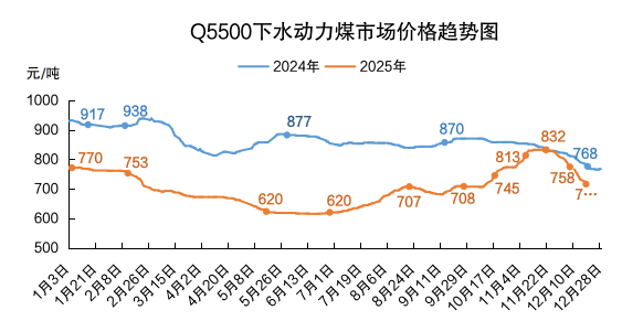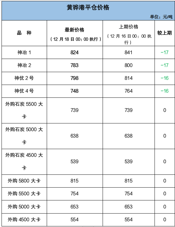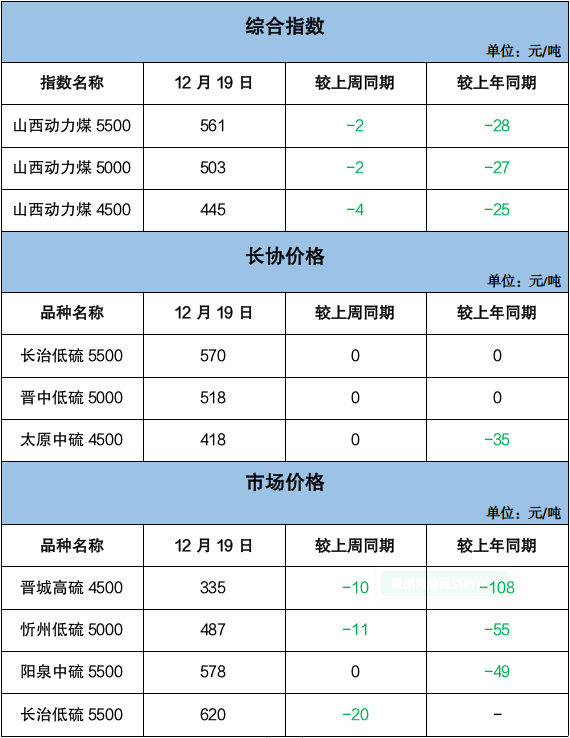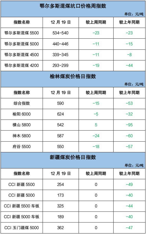 下水煤方面,12月份电煤年度长协Q5500价格694元/吨,月环比涨10元/吨、同比降2元/吨。阶段性降温降需天气对终端需求提振有限,业内观望情绪仍在蔓延,刚需用户少量压价询盘,贸易商出货压力较大,报价继续向下调整。截至12月19日,CCI 5500报收于716元/吨,周环比降42元/吨,同比降64元/吨,与同热值年度长协价价差收窄至22元/吨。