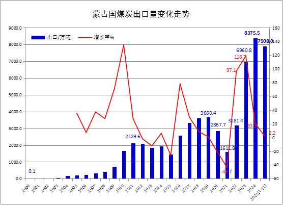 据蒙古国海关机构(Mongolian Customs Service)发布的统计数据显示,2025年1-11月,蒙古国煤炭出口量累计为7908.91万吨,比上年同期增加171.3万吨,同比增长2.2%。其中,硬煤(2701)出口量为7381.86万吨,同比下降0.3%;褐煤(2702)出口量为527.05万吨,同比增长57.5%。