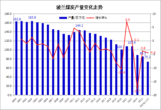 据波兰中央统计局( Central Statistical Office of Poland)发布的主要工业产品产量月度统计数据,2025年1-11月,波兰煤炭(包括硬煤Hard coal和褐煤Lignite)总产量累计为7413.27万吨,较去年同期下降4.4%。