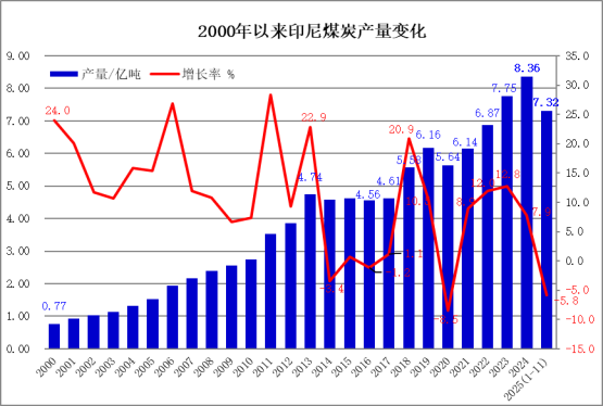 据“彭博技术”(Bloomberg Technoz)网站2026年1月7日发布的信息, 印度尼西亚煤炭矿业协会(Indonesian Coal Mining Association - APBI)报告称,2025年1-11月,印尼煤炭产量实现约7.315亿吨,较2024年同期的7.767亿吨下降5.8%。