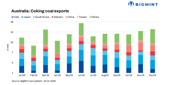 BigMint 的数据显示,2025年1-12月,澳大利亚炼焦煤出口量为1.485亿吨,较2024年同期的1.563亿吨下降5%。