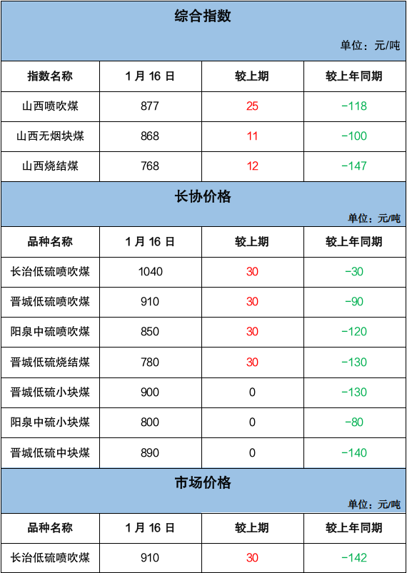 本周无烟煤矿开工稳定,原煤产量平稳释放,坑口库存小幅减少,无烟煤价格以涨为主。省内大型煤企末煤长协车板价格普遍上调30元/吨;晋城地区地方煤企喷吹煤长协车板价格上调40元/吨,块煤长协车板价格上调30元/吨。坑口销售中,长治地区喷吹煤市场价格周环比涨30元/吨,同比跌142元/吨;晋城地区小块煤市场价格周环比涨44元/吨,同比跌75元/吨;阳泉地区小块煤市场价格周环比跌2元/吨,同比跌121元/吨。截至1月16日,无烟小块坑口含税价格在787-890元/吨之间;喷吹煤坑口含税价格在786-915元/吨之间。