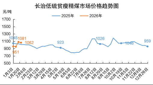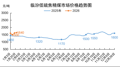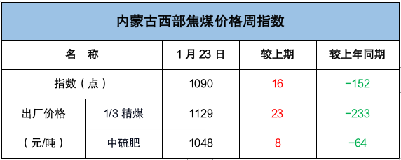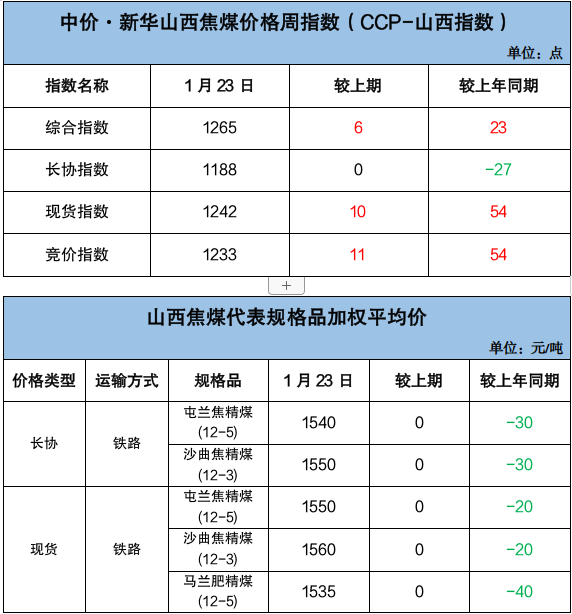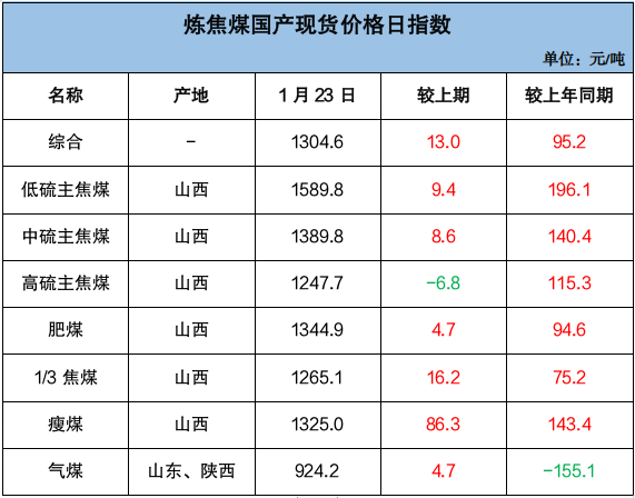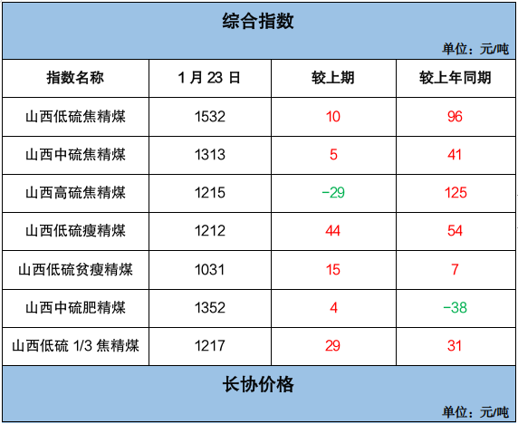 山西炼焦煤市场分化调整运行,产地煤价小幅涨跌。长治地区主要煤企再度上调瘦煤、贫瘦煤长协车板价格30元/吨,涨后长治低硫瘦精煤价格1150元/吨、贫瘦精煤价格1050元/吨;坑口销售价格涨势收敛、部分回调,临汾地区主焦煤及1/3焦煤市场价格补涨20-50元/吨,吕梁地区主焦煤、长治地区贫瘦煤市场价格下跌19-59元/吨。截至1月23日,临汾低硫焦精煤市场价格1640元/吨,周环比涨20元/吨,同比涨240元/吨;吕梁高硫焦精煤市场价格1152元/吨,周环比跌59元/吨,同比涨232元/吨。