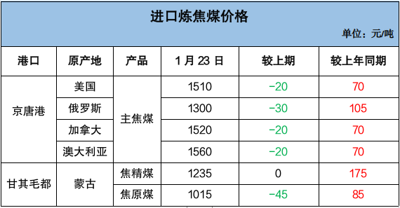 港口进口炼焦煤价格小幅回落。京唐港进口主焦煤价格周环比跌20-30元/吨,同比涨70-105元/吨;甘其毛都蒙古焦精煤价格周环比持平、焦原煤周环比跌45元/吨,同比涨85-175元/吨。截至1月23日,京唐港俄罗斯主焦煤价格1300元/吨,澳大利亚主焦煤价格1560元/吨,甘其毛都蒙古焦精煤价格1235元/吨。