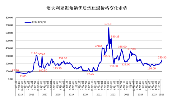 据标普全球普氏(Platts)价格指数数据显示,上周五(2026年1月23日),澳大利亚优质低挥发份(PLV)硬焦煤(HCC)离岸价(FOB)上涨至250.3美元/吨,较前一周每吨上涨15.3美元,上涨6.51%,较今年初价格上涨14.22%,创2024年7月以来18个月的新高。
