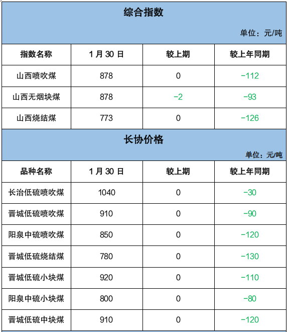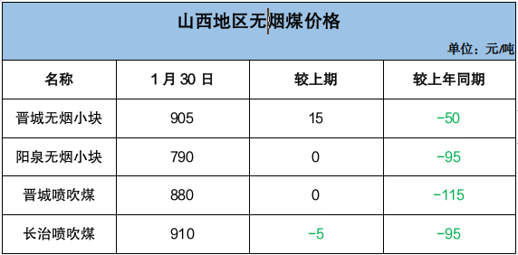 部分矿井短暂停产,无烟煤矿开工高位小幅下滑。无烟煤市场氛围平平,坑口库存小幅增加。无烟煤价格以稳为主。省内大型煤企块末煤长协车板价格持稳,个别地方煤企块煤长协车板价格上调40元/吨。坑口销售中,晋城地区中块煤市场价格周环比跌13元/吨,同比跌89元/吨。其余品种市场价格持平。截至1月30日,无烟小块坑口含税价格在790-916元/吨之间;喷吹煤坑口含税价格在786-910元/吨之间。