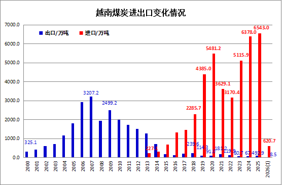 2026年1月份,越南煤炭进口大幅增加,当月煤炭进口量为620.66万吨,同比增加23.8%,环比增长27.2%;煤炭出口量为8.52万吨,同比增加1.33倍,环比下降54.3%。