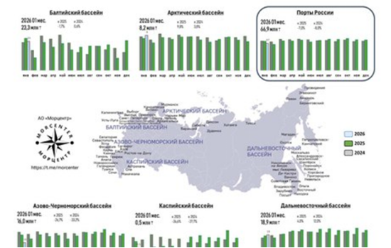 海港协会的数据显示,2026年1月份,俄罗斯海港干散货吞吐量为3100万吨(同比下降10.4%),其中包括:煤炭1360万吨(下降11.2%)、谷物340万吨(下降14.5%)、集装箱货物410万吨(下降10.9%)、矿物肥料380万吨(下降3.3%)、黑色金属170万吨(下降20.9%)、矿石110万吨(增长7%)、散装货物0.8百万吨(增长37.9%)。