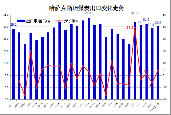 据哈萨克斯坦共和国战略规划与改革署国家统计局(Bureau of National statistics of Agency for Strategic planning and reforms of the Republic of Kazakhstan)发布的最新统计数据显示,2025年1-12月,哈萨克斯坦煤炭出口量累计为3042.57万吨,较上年同期增长3.7%。其中,硬煤(Hard coal)出口量为2937.69万吨,同比增长6.1%;褐煤(Lignite)出口量为104.87万吨,同比下降37.0%。