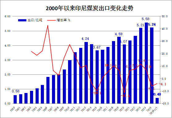 据印度尼西亚国家统计局(BPS)2026年3月2日发布的统计数据显示,2025年,印尼煤炭出口总量为52399.76 万吨,比上年同期减少3375.82万吨,同比下降6.1%。