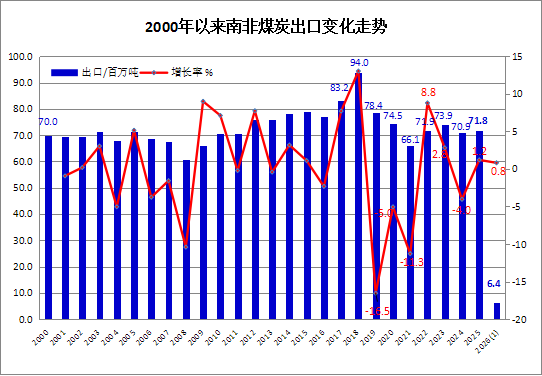 2026年1月份,南非煤炭出口量为640.9万吨,同比增加0.8%,环比增长4.7%。