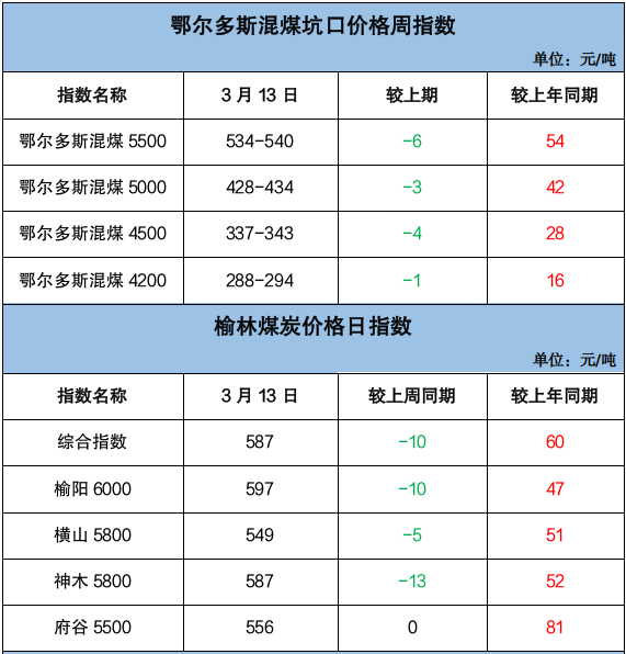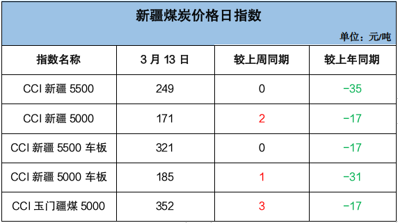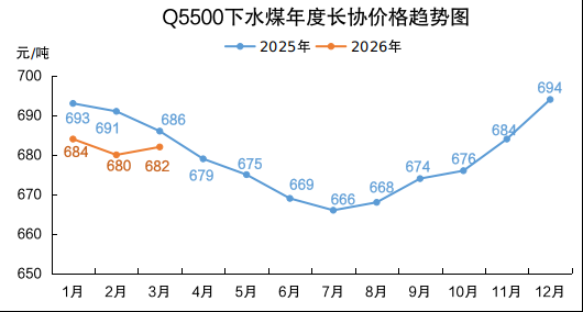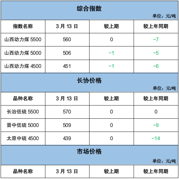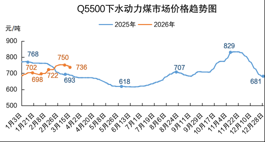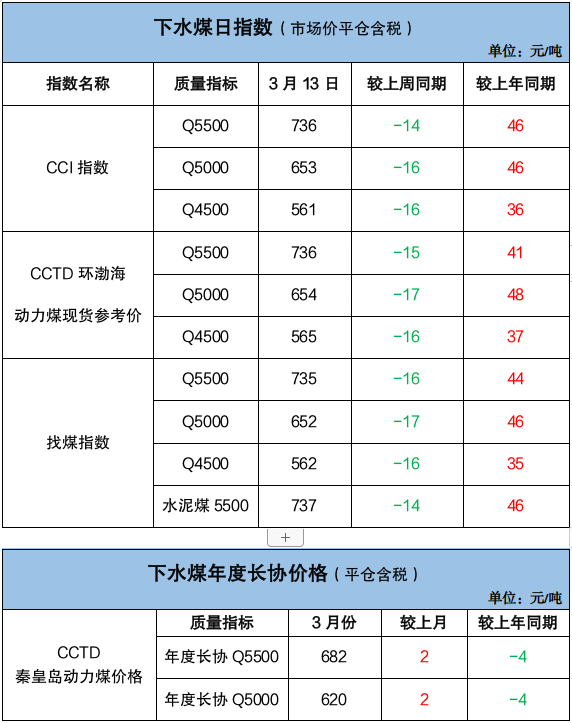 下水煤方面,3月份电煤年度长协Q5500价格682元/吨,月环比涨2元/吨,同比降4元/吨。终端需求持续低迷,用户谨慎观望,采购积极性不高,北方港口市场氛围冷清,价格延续偏弱下行走势。截至3月13日,CCI 5500报收于736元/吨,周环比降14元/吨,同比涨46元/吨,较同热值年度长协价偏高54元/吨。