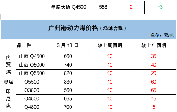 广州港内外贸煤价格普遍上涨10元/吨,截至3月13日,印尼煤Q4500场地含税价665元/吨,澳大利亚Q5500品种场地含税价830元/吨,同品质内贸煤性价优势维持在5-10元/吨不等。