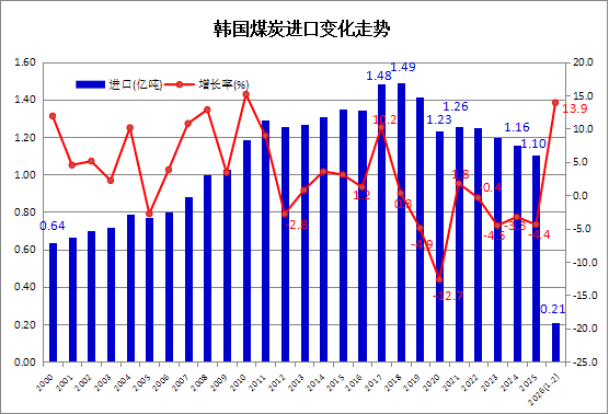 据韩国海关(Korea Customs Service -KCS)发布的最新统计数据显示,2026年1-2月,韩国煤炭进口量累计为2070.6万吨,比上年同期增长13.9%。其中,2月份煤炭进口量为972.91万吨,同比增长14.8%,环比下降11.4%。