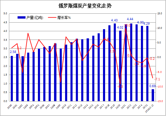 据俄罗斯联邦统计局 (Росстата)3月25日发布的工业生产统计月报数据显示,2026年1-2月,俄罗斯煤炭产量累计为6860万吨,比去年同期下降7.1%。