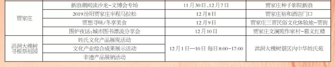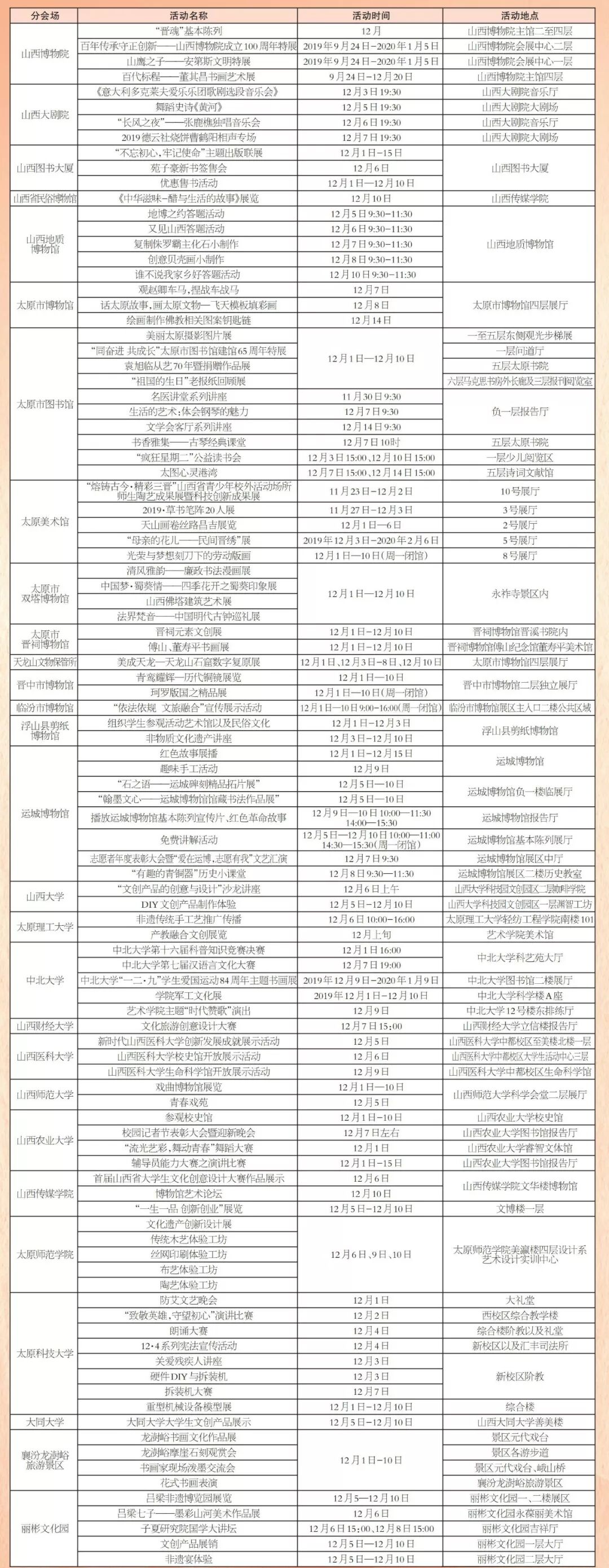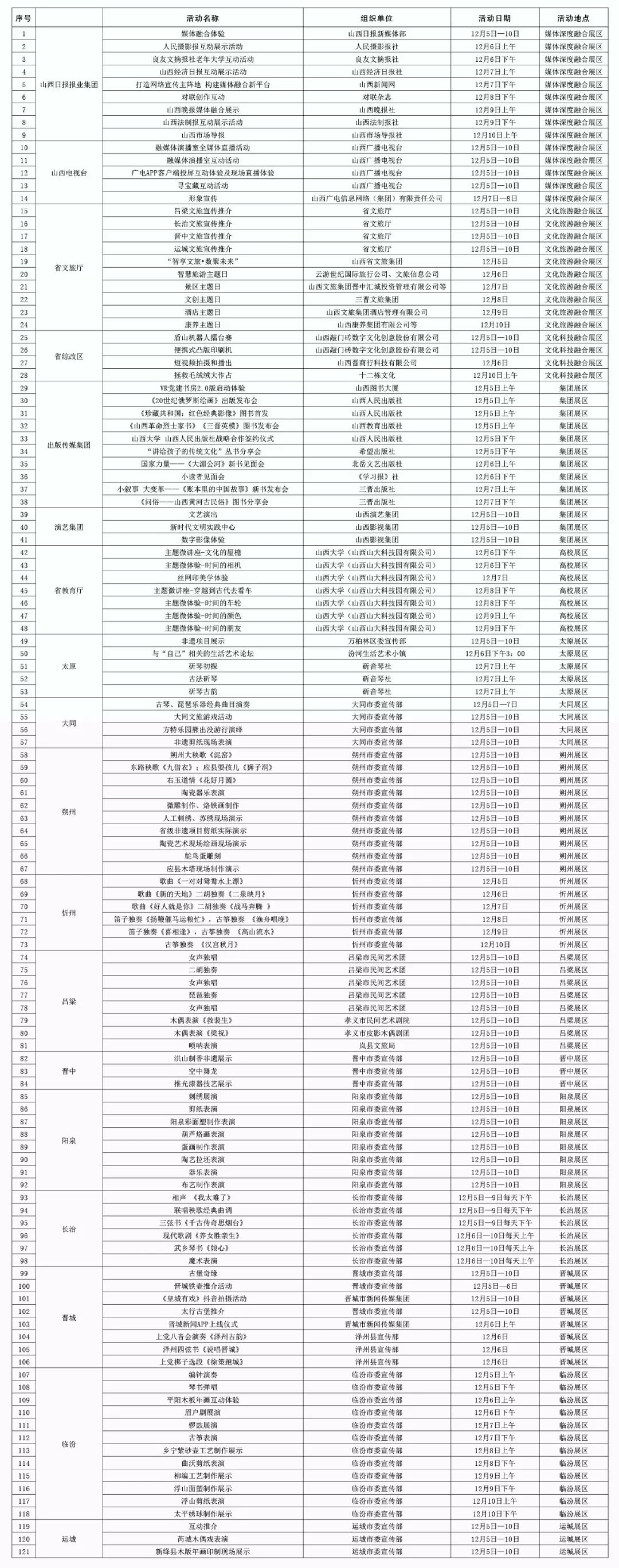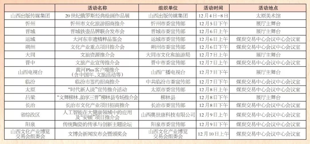 第四届文博会展览展示 时间:12月5日-12月10日 地点:中国(太原)煤炭交易中心展览中心 主办:山西文化产业博览交易会组委会 全省重点文化产业项目签约仪式 时间:12月5日11:00-12:00 地点:中国(太原)煤炭交易中心会议中心二楼交易大厅 主办:山西文化产业博览交易会组委会 文化旅游融合发展高峰论坛 时间:12月5日15:00-17:00 地点:中国(太原)煤炭交易中心会议中心二楼交易大厅 主办:山西文化产业博览交易会组委会 (共15场) (点击可查看大图) (共76场) (共120场) (点击查看大图) (共107场) (点击查看大图) (共86场) (点击查看大图) (活动较多,可下载放大查看) 407场文化活动, 种类繁多、精彩纷呈、惊喜不断, 堪称文化届的“饕餮盛宴”, 如此丰富的活动, 总有一款适合您, 12月5日,第四届山西文博会, 我们静待您的光临, 共襄文化盛宴,共享文博精彩。