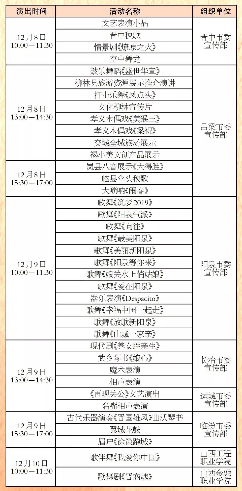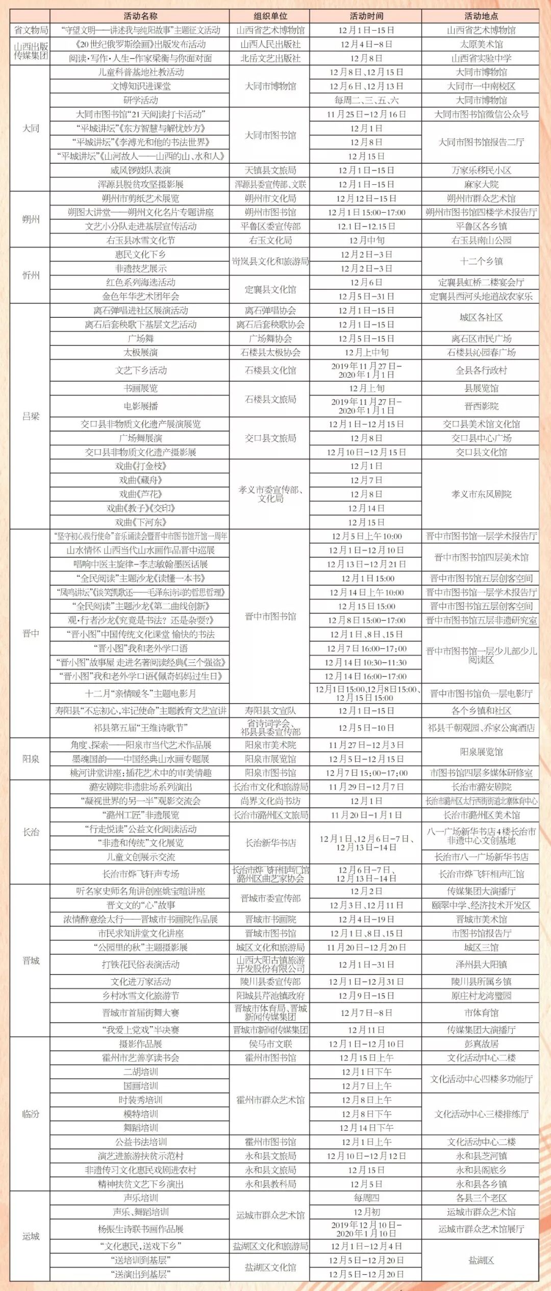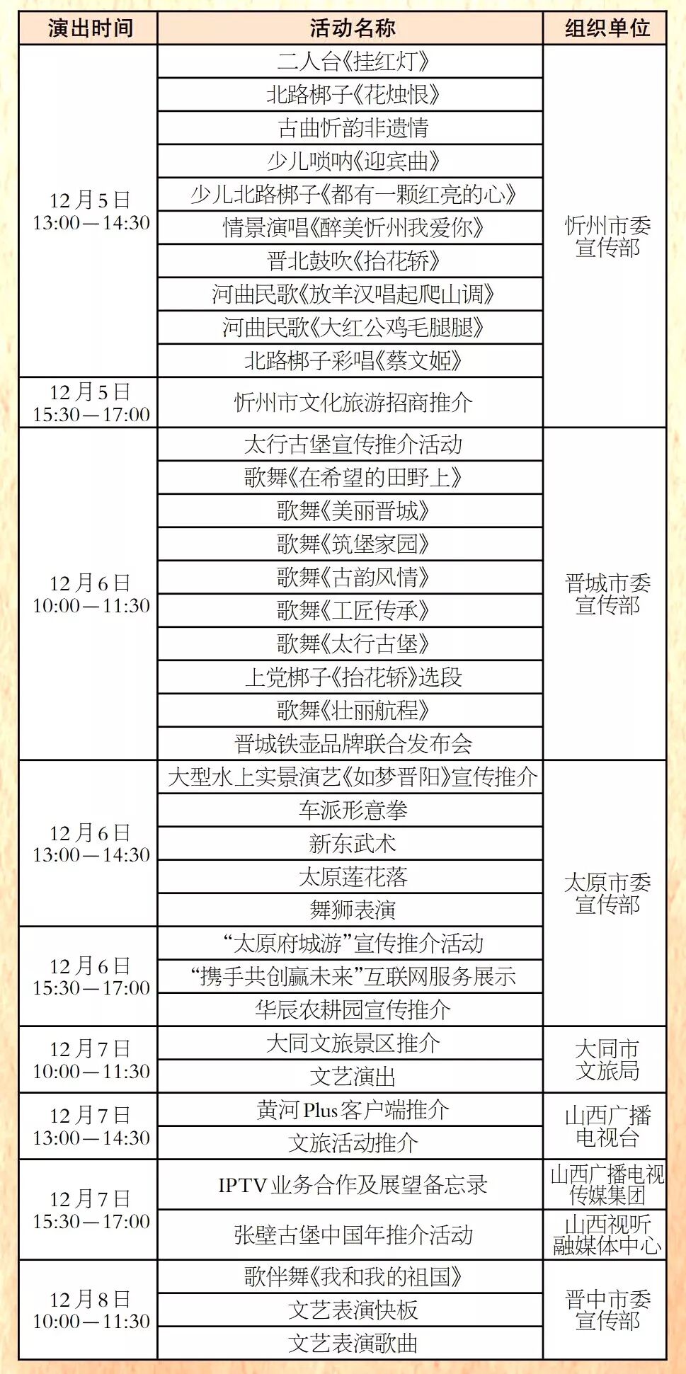 第四届文博会展览展示 时间:12月5日-12月10日 地点:中国(太原)煤炭交易中心展览中心 主办:山西文化产业博览交易会组委会 全省重点文化产业项目签约仪式 时间:12月5日11:00-12:00 地点:中国(太原)煤炭交易中心会议中心二楼交易大厅 主办:山西文化产业博览交易会组委会 文化旅游融合发展高峰论坛 时间:12月5日15:00-17:00 地点:中国(太原)煤炭交易中心会议中心二楼交易大厅 主办:山西文化产业博览交易会组委会 (共15场) (点击可查看大图) (共76场) (共120场) (点击查看大图) (共107场) (点击查看大图) (共86场) (点击查看大图) (活动较多,可下载放大查看) 407场文化活动, 种类繁多、精彩纷呈、惊喜不断, 堪称文化届的“饕餮盛宴”, 如此丰富的活动, 总有一款适合您, 12月5日,第四届山西文博会, 我们静待您的光临, 共襄文化盛宴,共享文博精彩。