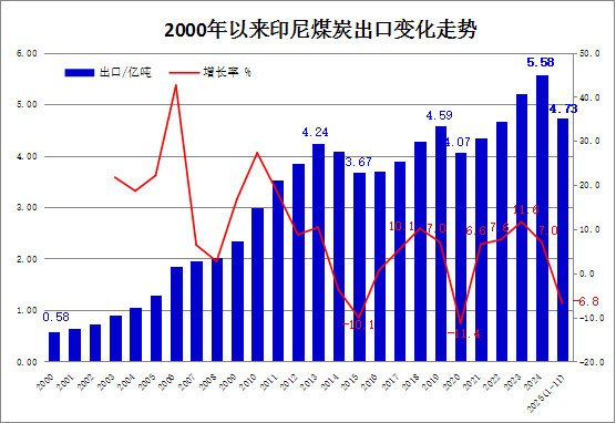 据印度尼西亚国家统计局(BPS)2026年1月5日发布的统计数据显示,2025年1-11月,印尼煤炭(包括褐煤)出口量累计为47279.4万吨,比上年同期减少3434.2万吨,同比下降6.8%。