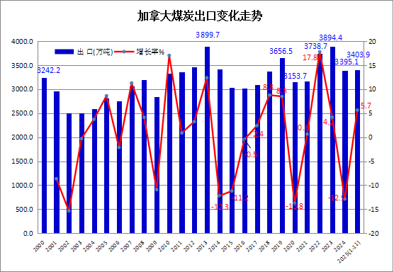 据加拿大统计局(Statistics Canada)发布的商品进出口统计数据,2025年1-11月,加拿大煤炭出口量累计为3403.9万吨,比上年同期增长5.7%。其中,11月份当月加拿大煤炭出口量为283.7万吨,同比增长22.4%,环比下降1.7%。