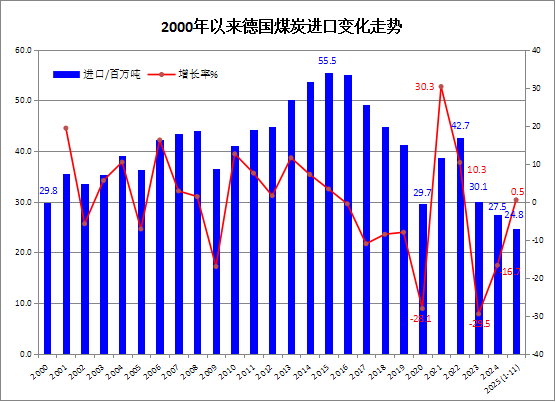 德国煤炭进口商协会发布的数据还显示,2025年前11个月,德国的硬煤发电量大幅上升,同比增长12.8%;而同期本国生产的生铁和粗钢产量则出现大幅下降,产量分别为1989万吨和3135万吨,同比下降10.7%和9.3%。