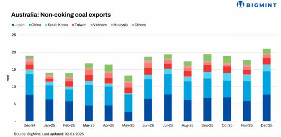据BigMint 此前根据船运数据发布的信息,2025年12月,澳大利亚动力煤(Non-coking coal,非焦煤)出口强劲反弹,从11月的1711万吨增至2113万吨,环比增长23.5%;与2024年12月的1897万吨相比,同比增幅为11.4%。