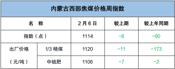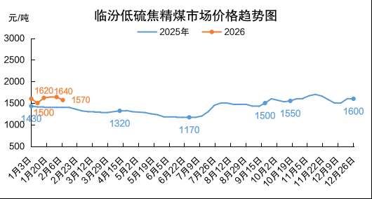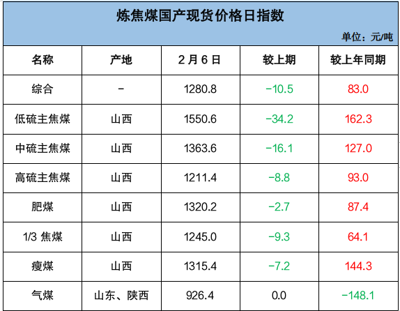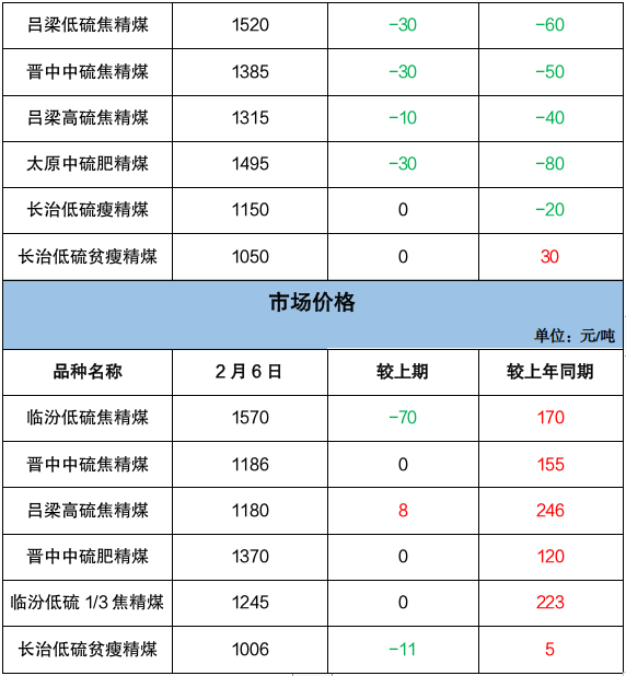 山西炼焦煤市场成交氛围转弱,产地煤价普遍回调,部分线上竞价品种出现流单现象。主要煤企炼焦煤长协车板价格下调10-30元/吨,跌后吕梁低硫焦精煤1520元/吨、太原中硫肥精煤1495元/吨;长治低硫瘦精煤维持1150元/吨。坑口销售价格窄幅涨跌,吕梁地区主焦煤市场价格上涨8元/吨,临汾地区主焦煤及长治地区贫瘦煤市场价格下跌11-70元/吨不等。截至2月6日,临汾低硫焦精煤市场价格1570元/吨,周环比跌70元/吨,同比涨170元/吨;吕梁高硫焦精煤市场价格1180元/吨,周环比涨8元/吨,同比涨246元/吨。