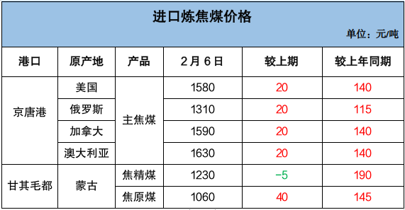 港口进口炼焦煤价格以涨为主。京唐港进口主焦煤价格周环比普涨20元/吨,同比涨115-140元/吨。甘其毛都蒙古焦精煤价格周环比跌5元/吨、焦原煤周环比涨40元/吨,同比涨145-190元/吨。截至2月6日,京唐港俄罗斯主焦煤价格1310元/吨,澳大利亚主焦煤价格1630元/吨,甘其毛都蒙古焦精煤价格1230元/吨。
