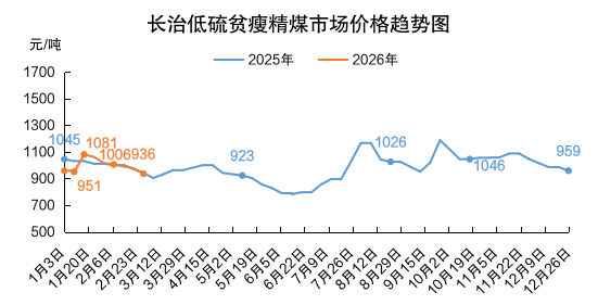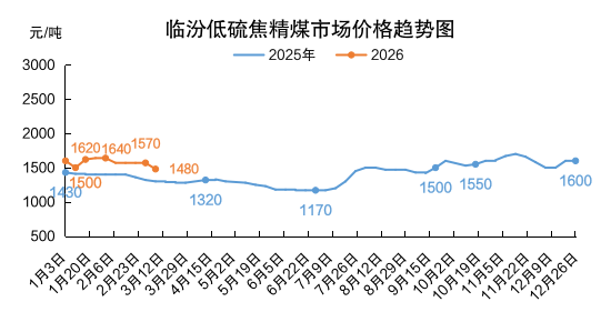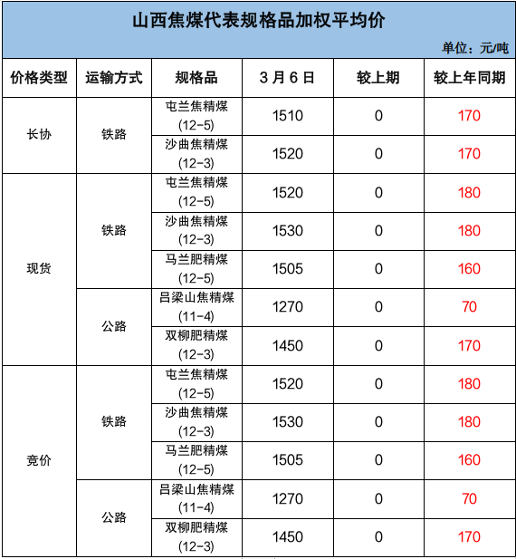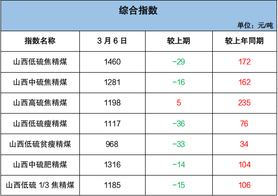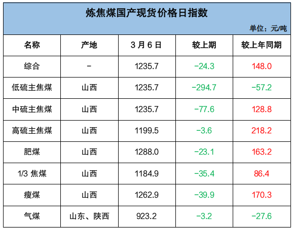 山西炼焦煤市场价格承压下跌。长治主要煤企瘦煤、贫瘦煤长协车板价格下调40-70元/吨;坑口销售及线上竞价市场跌幅有所扩大,主焦煤市场价格下跌7-90元/吨、配焦煤市场价格下跌10-40元/吨。截至3月6日,临汾低硫焦精煤市场价格1480元/吨,周环比跌90元/吨,同比涨180元/吨;吕梁高硫焦精煤市场价格1158元/吨,周环比跌7元/吨,同比涨250元/吨。