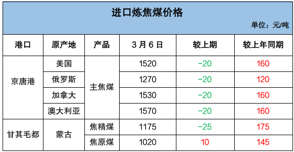 进口炼焦煤价格小幅下跌。京唐港多国进口主焦煤价格周环比跌20元/吨,同比涨120-160元/吨。甘其毛都蒙古焦原煤价格周环比涨10元/吨、焦精煤跌25元/吨,同比涨145-175元/吨。截至3月6日,京唐港俄罗斯主焦煤价格1270元/吨,澳大利亚主焦煤价格1570元/吨,甘其毛都蒙古焦精煤价格1175元/吨。